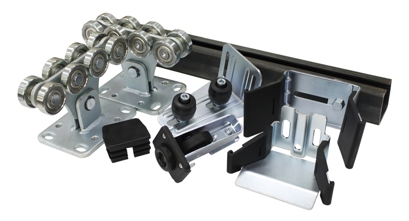 Фурнитура для откатных ворот: Рельс направляющий (черный металл) / Опора роликовая / Заглушка / Скоба направляющая / Ловитель верхний и нижний / Ролик концевой.